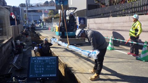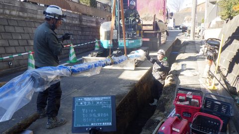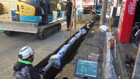 今回は、多摩市愛宕四丁目18番地先から同市愛宕四丁目17番地先間で行なった配水小管布設替工事の様子をご紹介いたします。